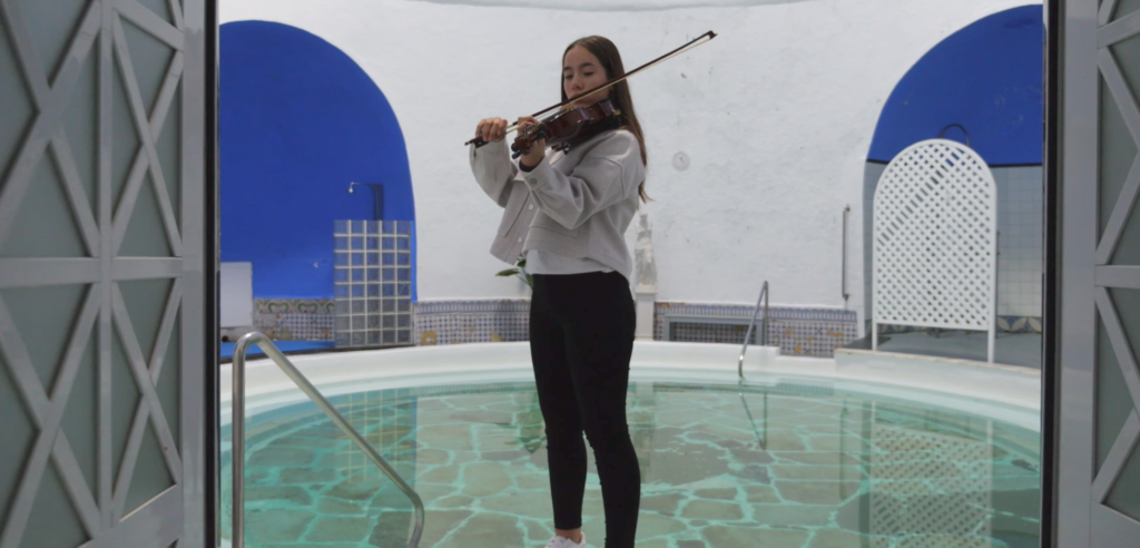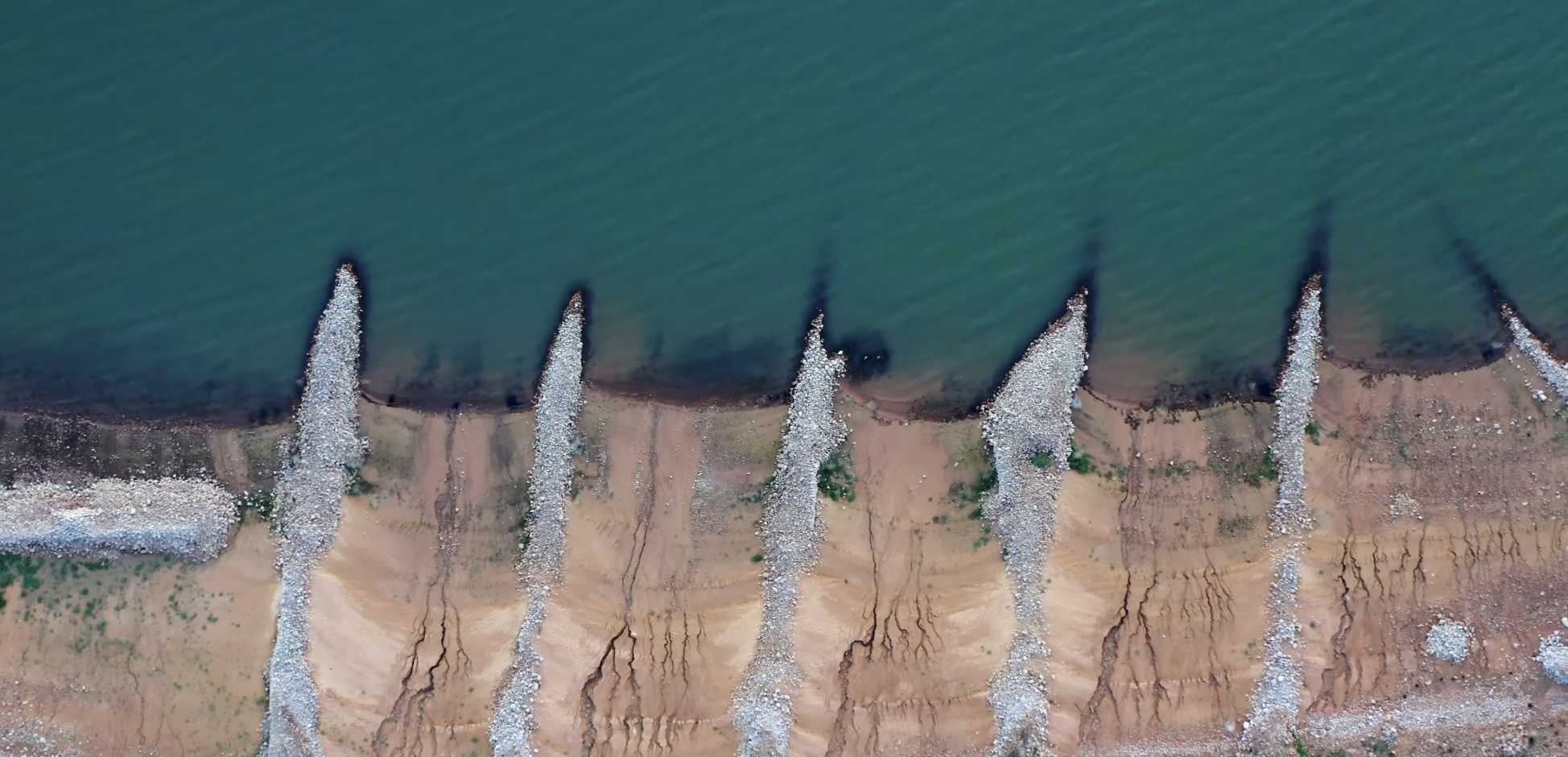Había que hablar del ritmo del agua, por lo que la idea de incluir a una persona tocando un instrumento se me hacía imprescindible, además busqué música en los encuadres, como la imagen que hay justo arriba donde un pentagrama de piedras se adentra en el agua del embalse, o aquellos en los que una gota marca el tempo propio de la música que es la lluvia.